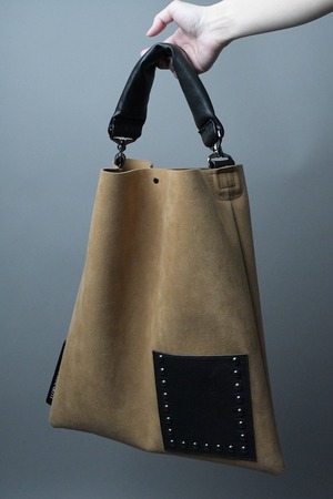・本体はスエード調の肌触りの人工皮革+柔らかい革の持ち手とポケットとの組み合わせで扱いやすさとラグジュアリー感も感じられるバッグ