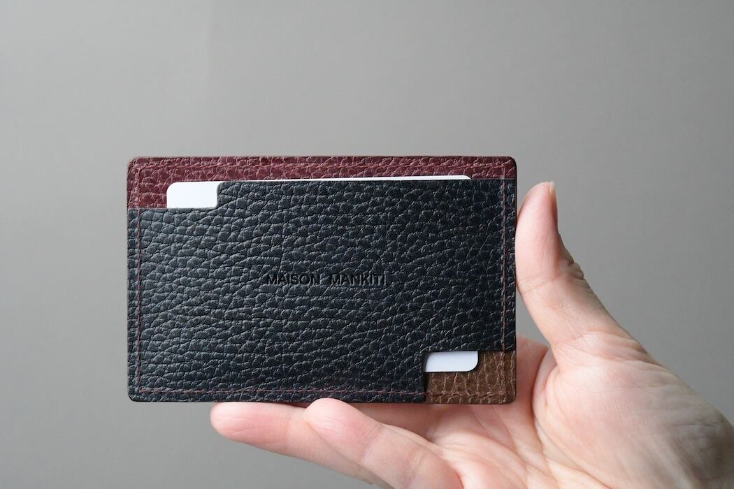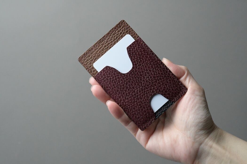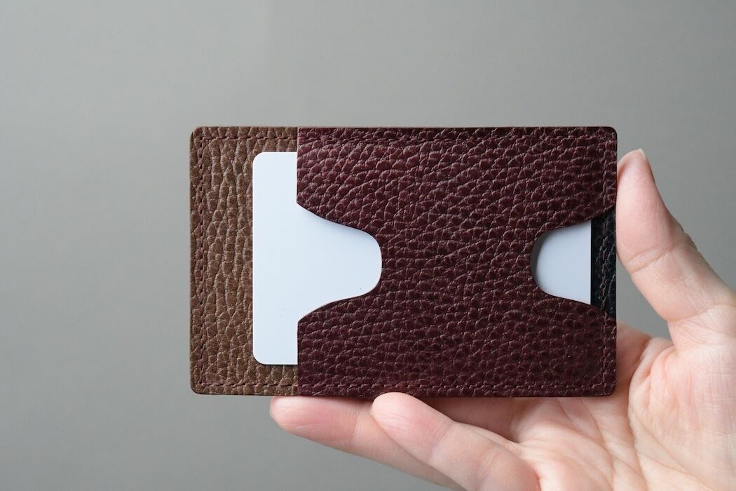 表のポケットにはカードが2~3枚程度収納可能で、裏のポケットには名刺や定期など一目で分かるスリットを備えています。