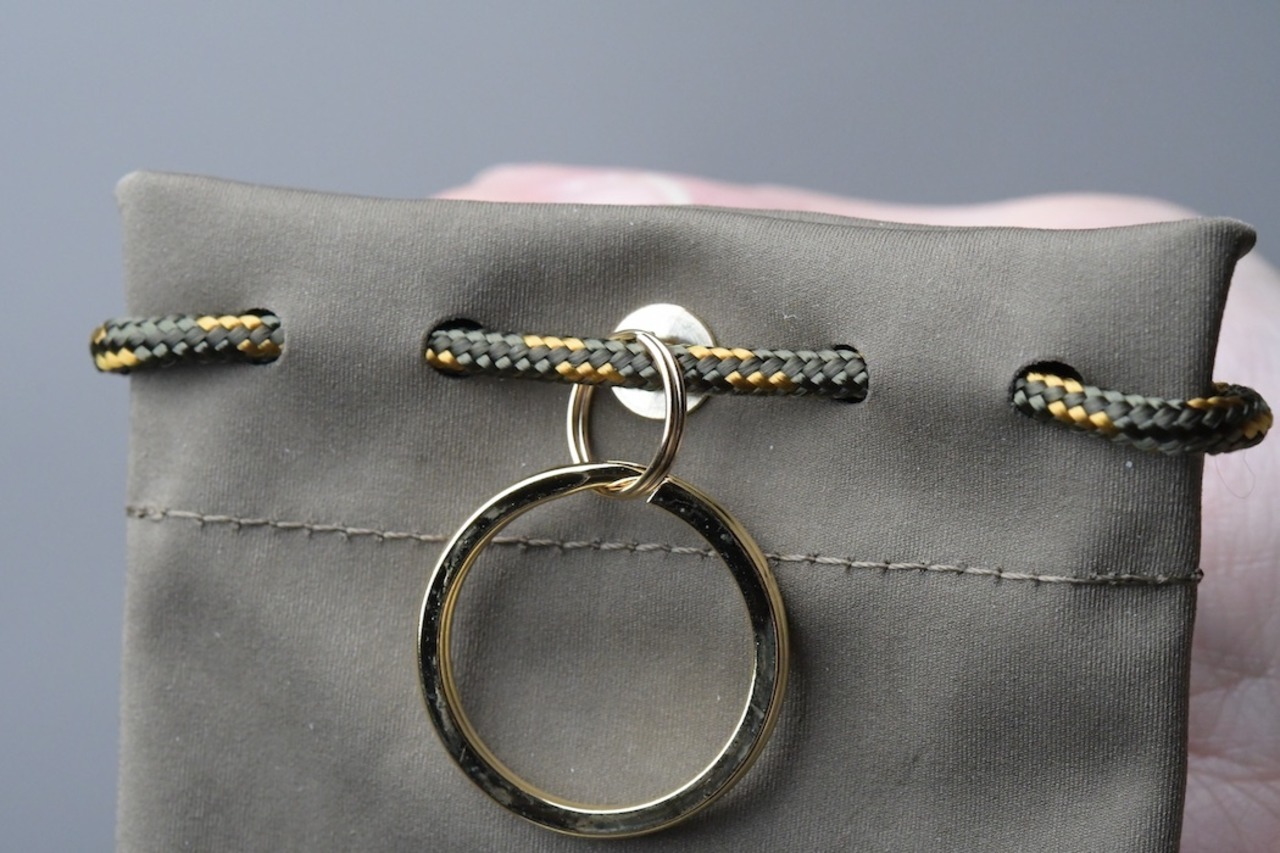 ・2WAY仕様 1>巾着として絞る 2>間口を狭めることなくプリムホックボタンで留める