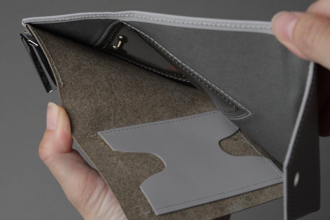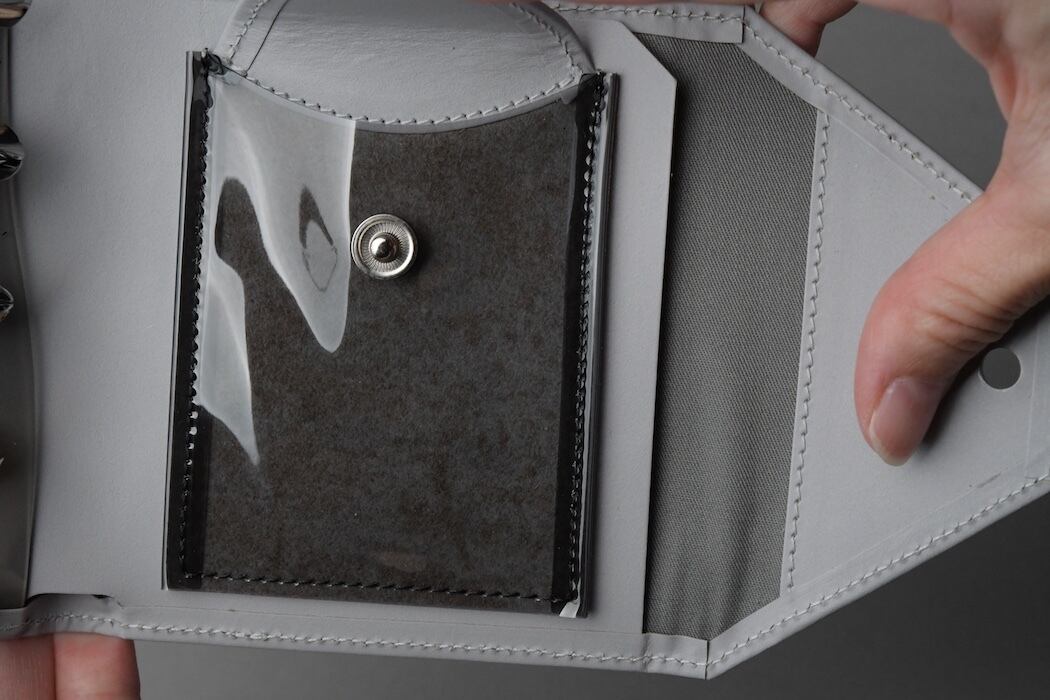 お札入れ1ヶ所、カードポケット3ヶ所、1円と5円を入れるPVCポケットがあります。